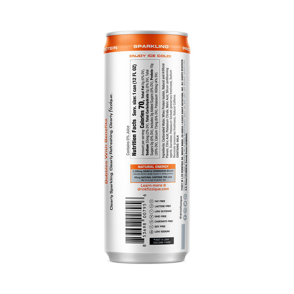 ABSOLUTELY NOTHING UNNECESSARY. fizzique sparkling protein water is also gluten free, GMO free, fat free, sugar free, soy free, no artificial preservatives, and no colors or dyes.