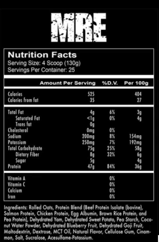 MRE is made from natural ingredients and a real protein blend. Our formula contains absolutely no whey! With MRE, we have given you the nutrients you need to repair and recover muscle tissue from the best possible whole foods sources. Stop reaching for fast foods and reach for whole foods with M.R.E.