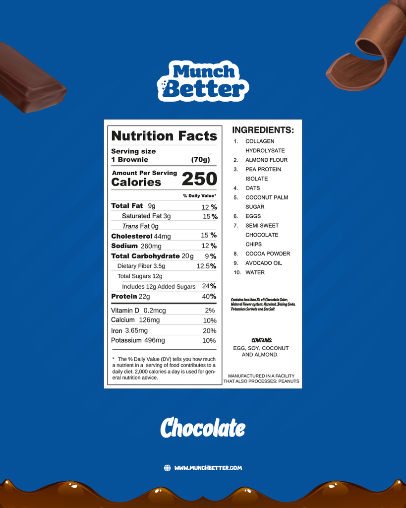 Munch BetterSometimes you just need something to munch on, and that’s okay! We’re here to help you munch better. Our brownies offer more than just mouth watering flavor and fudgey texture. We've packed in 22g of protein with a 1:1 protein to carb ratio, no GMOs, zero gluten products and all while remaining 100% dairy free. The better choice has never been more obvious.