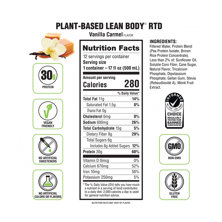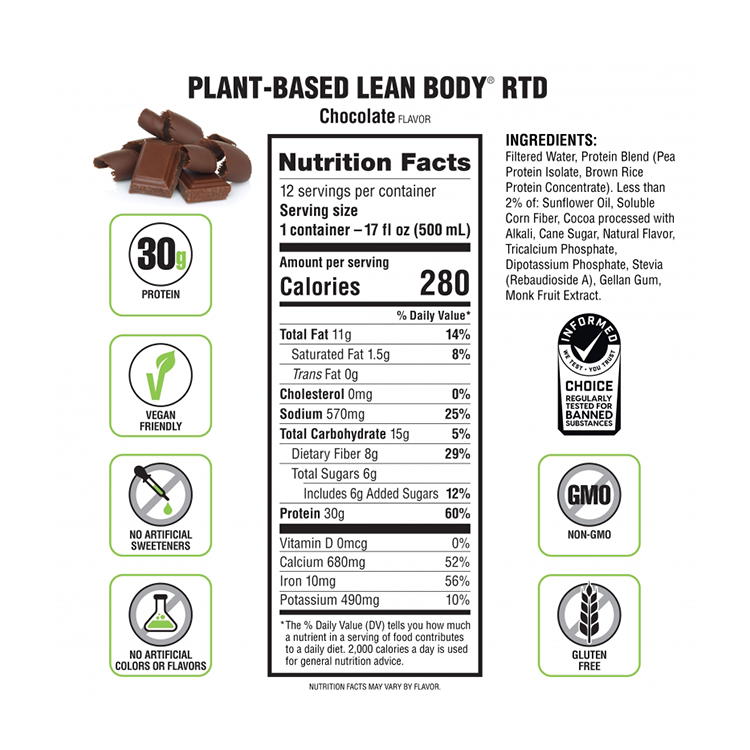 Plant-Based Lean Bodyå¨ Ready-to-Drink Protein Shake is convenient, high-protein, non-GMO vegan nutrition to fuel your healthy, active life. Made with natural, plant-based ingredients, Lean Bodyå¨ can help you look and feel your best. Plant-Based Lean Bodyå¨ contains no gluten, dairy, artificial sweeteners, colors, or flavors. Savor the rich, smooth taste in every shake!