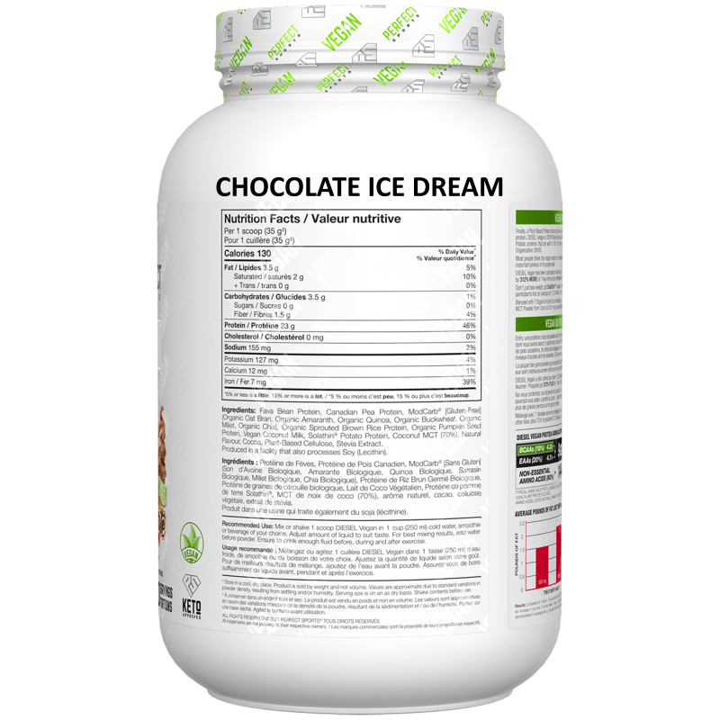 DIESEL Vegan is a 100% Whole Food, Plant-Based blend of 5 unique proteins and the first fully vegan protein with human-matched levels of amino acids that are within 13% of levels as stated by the World Health Organization (W.H.O.).
