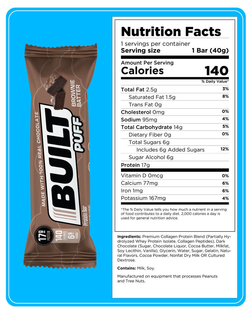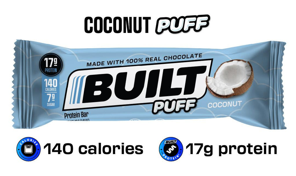 BuiltNow gluten free! Our most popular chocolatey puff. Gluten-free brownie-marshmallow covered by 100% chocolate. This Puff has a delicious brownie batter flavor, perfect fluffy texture, and it is covered in Built’s signature 100% chocolate. This will have you completely forgetting that you are eating a protein bar. No need to pinch yourself, this is real life.
