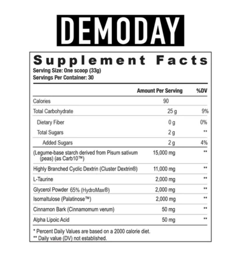 DEMO DAY IS MORE THAN A CARBOHYDRATE POWDER, IT’S A COMPREHENSIVE PERI-WORKOUT SUPPLEMENT. DEMO DAY CONTAINS 25 GRAMS OF CARBOHYDRATES PER SERVING, ALONG WITH MULTIPLE INGREDIENTS THAT WILL HELP DIRECT THE CARBS TO YOUR MUSCLES AND BOOST PERFORMANCE, SUCH AS: