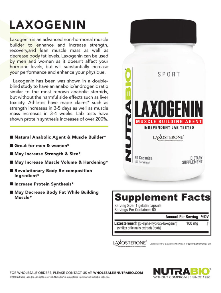 NutrabioLaxogenin is an advanced non-hormonal muscle builder to enhance and increase strength, recovery, and lean muscle mass as well as decrease body fat levels. Laxogenin can be used by men and women as it doesn’t affect your hormone levels, but will substantially increase your performance and enhance your physique.