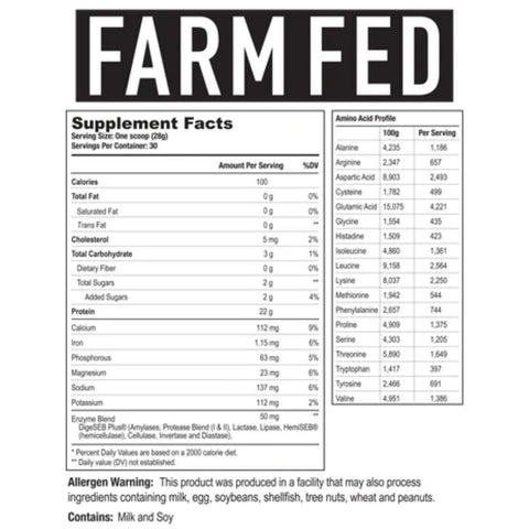 SINCE FARM FED USES THE PUREST PROTEIN SOURCE ON THE MARKET, IT’S RICH IN NATURALLY OCCURRING ESSENTIAL AMINO ACIDS (EAAS) AND BRANCHED-CHAIN AMINO ACIDS (BCAAS) AND NEVER AMINO-SPIKED! EACH SERVING OF FARM FED CONTAINS APPROXIMATELY 100 CALORIES, 22 GRAMS OF PROTEIN, AND 2.2 GRAMS OF LEUCINE.
