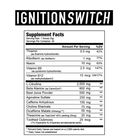 WITH A COMBINATION OF CAFFEINE ANHYDROUS, INFINERGY™ (DICAFFEINE MALATE), TEACRINE®, AND FIVE B VITAMINS, IGNITION SWITCH PROVIDES YOU WITH SUSTAINED ENERGY LEVELS THAT LAST HOURS AFTER YOU’RE FINISHED TRAINING. UNLIKE OTHER STIMULANT-BASED PRE-WORKOUTS, IGNITION SWITCH WON’T CAUSE THE DREADED ENERGY CRASH, SO YOU CAN CARRY ON THROUGHOUT YOUR DAY AT FULL SPEED.