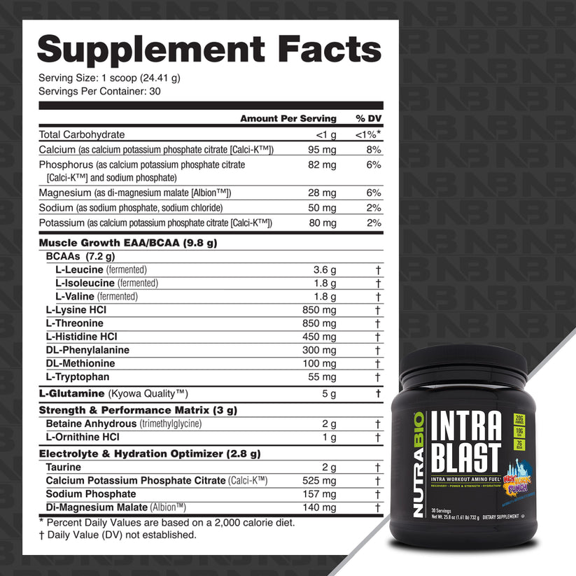 In a world where everyone has the same old amino acid recovery products, NutraBio zigged when everyone else zagged, which led us to launch one of today's most unique and sought-after intra-workout products. NutraBio Intra Blast was specifically formulated to take into account every aspect of recovery and muscle growth to support you in your effort to achieve your fitness and physique goals.