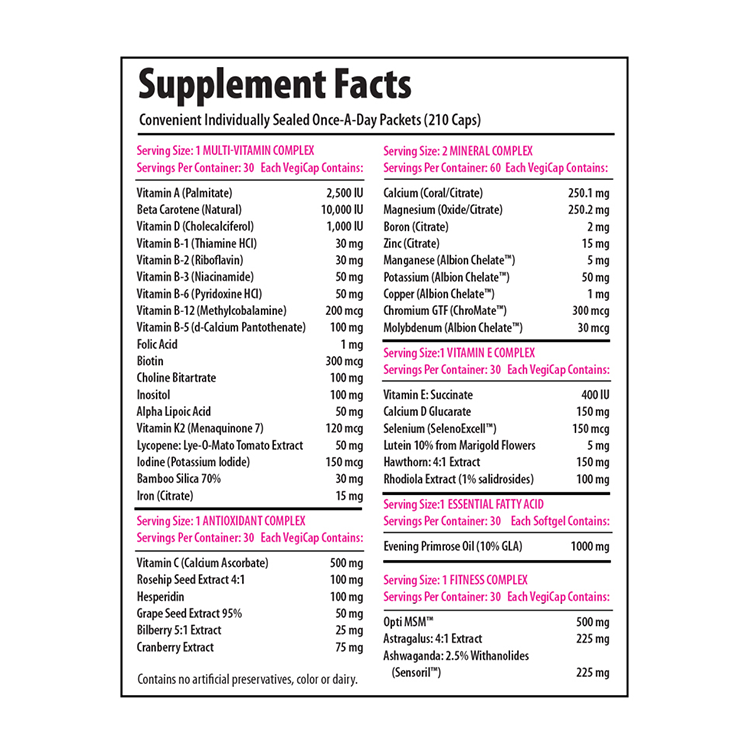 ProlineWHY VITA-PAKS FOR WOMEN ARE BETTER THAN A ONE-A-DAY MULTI- VITAMIN PILL? These days, many women take a one-a-day multiple vitamin and mineral pill and think they are getting enough nutritional protection with that simple act. Some of the multi-vitamins go up to 2 or 3 pills per serving, offering a little more in the way of nutrients, and for some this may be sufficient. But, for others, with an active and/or athletic lifestyle, not to mention those with a poor diet, a couple of pills simply won’t measure up. There is just not enough room in one to three pills to provide enough of all the nutrients required to protect our health and well- being from the toll taken by a highly stressful life. And, while an active and athletic lifestyle may be good for our long term health, in the short term it is a huge stress on the body; a stress that can be compensated for with proper nutrition and supportive supplements. Those simple multivitamins have no room to offer adequate levels of vitamin C, vitamin E, essential fatty acids (which are in liquid form and need to be in softgel pills) or minerals, let alone room for supportive herbs in adequate amounts to accomplish anything nutritionally significant.